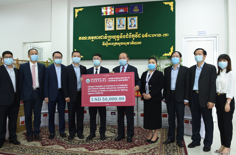 5月8日,中國電建柬埔寨代表處國別代表趙金輝以柬埔寨中國商會秘書長身份與中國商會會長敬駿、常務副會長王化斌等率在柬中資企業(yè)向柬政府捐贈一批防疫物資,并以“抗疫基金”名義向柬衛(wèi)生部捐贈5萬美元,用于支持政府防控委員會防疫。柬埔寨衛(wèi)生部大臣曼本亨感謝中國商會及中資企業(yè)為柬防控疫情作出的努力。