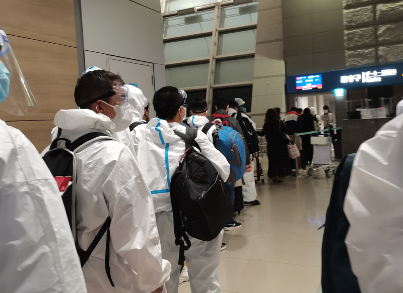 9月23日上午,項目團隊第一批返科團隊從貴陽出發(fā),接受了臨行前的核酸檢查,領取了防護物資、防疫藥物,并以承諾人身份簽署了嚴格遵守疫情防控隔離要求書。此次征程艱難曲折,貴陽--成都--首爾--迪拜(隔離14天)--科威特(隔離14天),其中最長候機時間超過14個小時。項目團隊歷時近1個月終于到達項目現(xiàn)場,其中艱難可想而知。