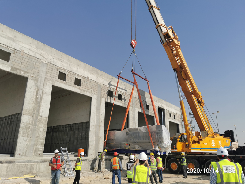 科威特國際機場項目設計了兩個11千伏開關站,共計25臺15KV/3500KVA柴油發(fā)電機組,作為T2航站樓的應急電源,是航站樓應急時刻的關鍵“心臟”。柴油發(fā)電機組作為科威特機場項目履約的重要節(jié)點,業(yè)主、監(jiān)理、總包等各方高度重視,從設備進場、卸貨、檢驗、轉運到吊裝的全過程,各方代表均蒞臨施工現(xiàn)場指導監(jiān)督。